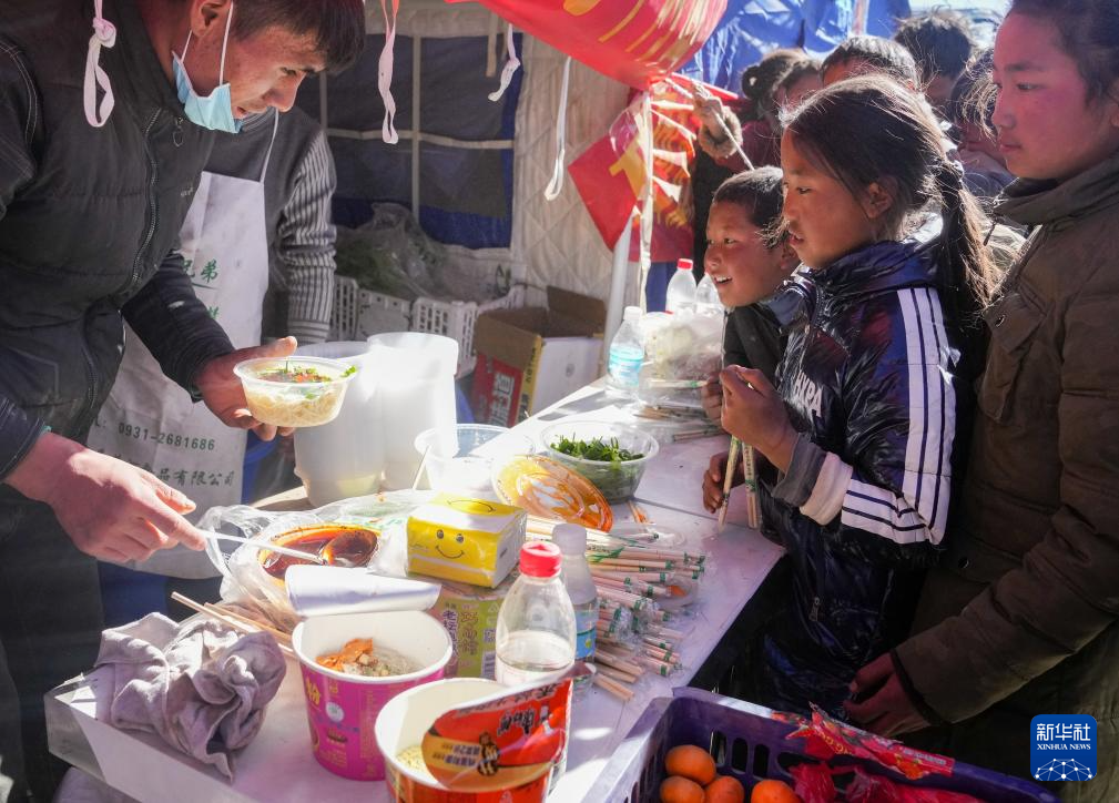 1月8日,在日喀則市定日縣長(zhǎng)所鄉(xiāng)森嘎村的臨時(shí)安置點(diǎn),馬仁(左一)為受災(zāi)小朋友免費(fèi)供應(yīng)面食。據(jù)馬仁介紹,他來(lái)自定日縣,和朋友一起來(lái)臨時(shí)安置點(diǎn)為災(zāi)區(qū)群眾免費(fèi)提供面食。據(jù)悉,從7日下午兩點(diǎn)開(kāi)始,他們已送出近1200份面食。新華社記者 丁汀 攝