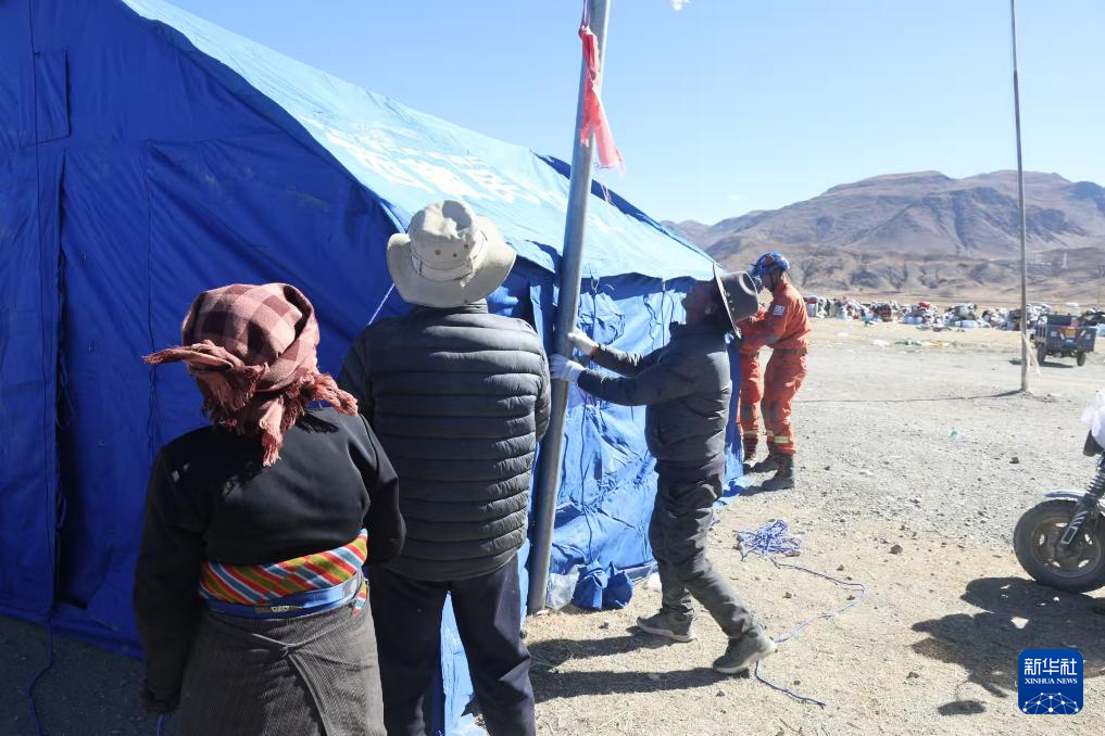 1月9日,救援人員在措布村幫助受災(zāi)群眾搭建帳篷。新華社記者 姜帆 攝