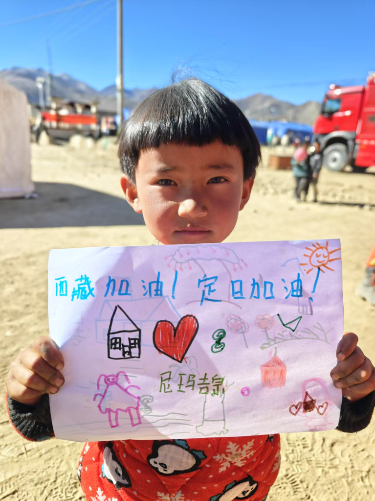 6歲的尼瑪吉宗穿著花棉襖,先畫了一頂小小的帳篷,在旁邊畫上了大大的紅心,把梳著羊角辮的自己也畫上去,天空畫上了太陽(yáng)。她想了想,工工整整地寫上:“西藏加油!”“定日加油!”