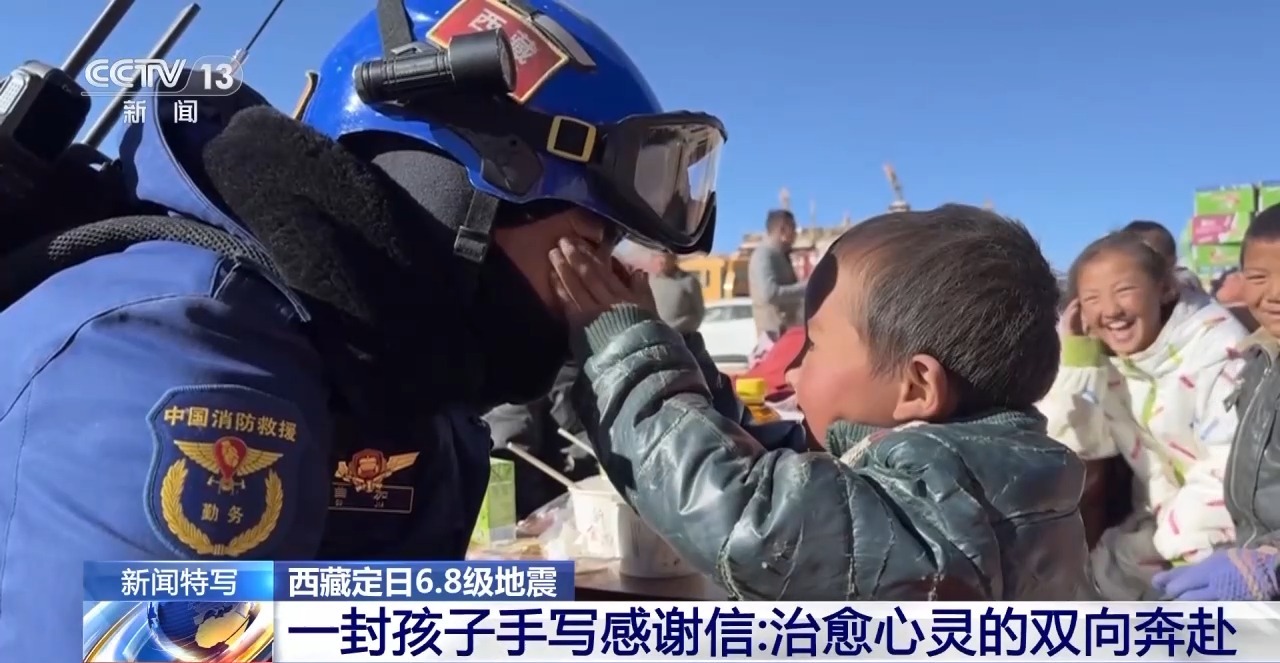 西藏森林消防總隊(duì)教育宣傳處助理員 鄭龍:能感覺到孩子在地震里受到的驚嚇正在慢慢減少,還會(huì)主動(dòng)過去找消防員玩,主動(dòng)“受領(lǐng)任務(wù)”,幫忙搬運(yùn)物資。