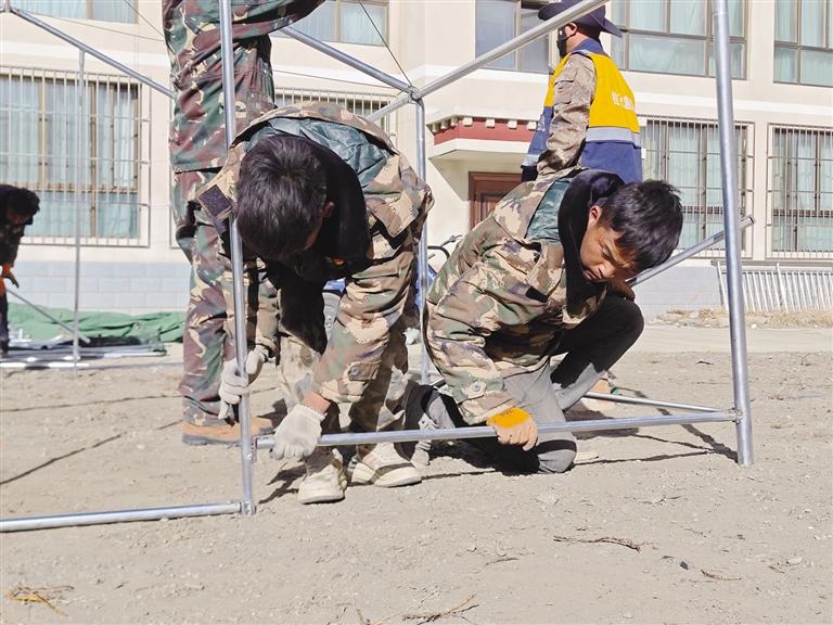 1月13日,拉孜縣芒普鄉(xiāng),4名身穿迷彩大衣的青年,正在救災物資間穿梭,稚嫩的臉上帶著與年齡不相符的沉穩(wěn)與堅毅。