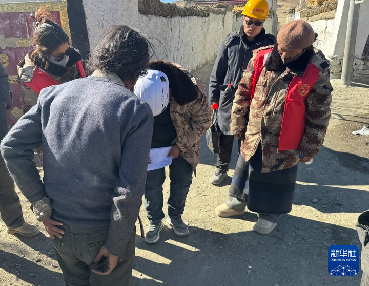 1月13日,次旺(右一)陪同工作組走訪村莊,評(píng)估房屋受損程度。新華社記者 格桑邊覺 攝