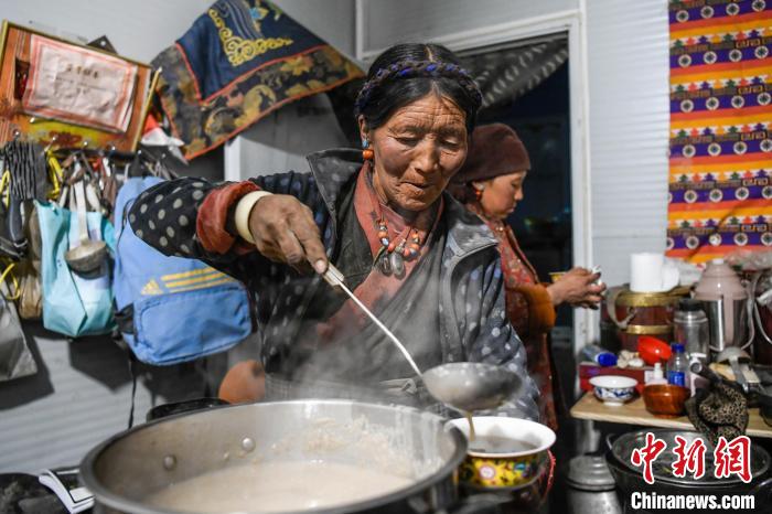 1月28日晚,西藏定日縣曲洛鄉(xiāng)措昂村安置板房?jī)?nèi),當(dāng)?shù)剞r(nóng)牧民迎來(lái)日喀則農(nóng)事新年“古突夜”,這是措昂村村民曲珍在盛“古突”。 貢嘎來(lái)松 攝