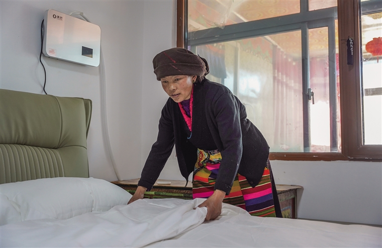 倫珠曲珍今年40歲,是這家的二女兒,15年前嫁到外村,每年都會(huì)回來看望父母。由于同行的人員出現(xiàn)高反癥狀,倫珠曲珍便主動(dòng)邀請(qǐng)記者到他們家的“高原暖心房”里休息調(diào)整?!案咴姆俊痹O(shè)置在她家客廳的里側(cè),屋內(nèi)寬敞明亮、干凈整潔。墻壁上的恒溫裝置讓屋子始終保持在宜人的20攝氏度左右。“我們打造的‘高原暖心房’恒溫效果特別好,最高溫度能達(dá)到30多攝氏度。而且因?yàn)槭褂玫牟馁|(zhì)特殊,就算不開恒溫裝置,幾個(gè)人待在屋里也不會(huì)覺得冷??纯催@些家具,都是村里愛心小屋提供的?!绷涡駯|介紹道。