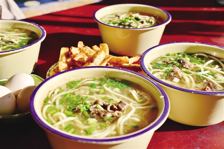 在西藏,人們總能將簡單的食材做出獨(dú)一無二的“西藏味道”。一壺甜茶,一碗藏面,一份炸土豆或肉餅,便是這里最標(biāo)準(zhǔn)的早餐套餐。清水、紅茶茶葉、甜奶粉或牦牛奶,只需簡單的食材,便能制作出茶香濃郁、奶味醇厚的甜茶。在略帶寒意的初春,喝上一口,整個(gè)身子都暖了起來。此時(shí)搭配一碗筋道的藏面,簡單又滿足。