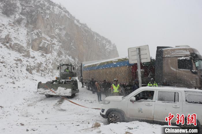 據(jù)了解,災情發(fā)生后,擔負該路段養(yǎng)護保通任務的武警第二機動總隊某支隊官兵迅速啟動道路除雪保通預案,抽組專業(yè)救援力量及大型救援裝備趕赴受阻路段實施搶通。受阻路段平均海拔處于4000米以上,持續(xù)降雪不斷,官兵們首先對滯留人員進行安撫,并發(fā)放食物和藥品等救援物資,為盡快清理路面積雪,官兵采取“機械協(xié)同先通后擴、人機配合高效救援”的方式同步展開作業(yè)。期間,一輛重載半掛車不慎陷入邊溝中,指揮員果斷調(diào)整方案,封控現(xiàn)場、撒布融雪劑、清理四周積雪、鋼絲繩牽引等步驟緊張有序的進行中……伴隨著發(fā)動機的轟鳴聲,車輛被成功救出。
