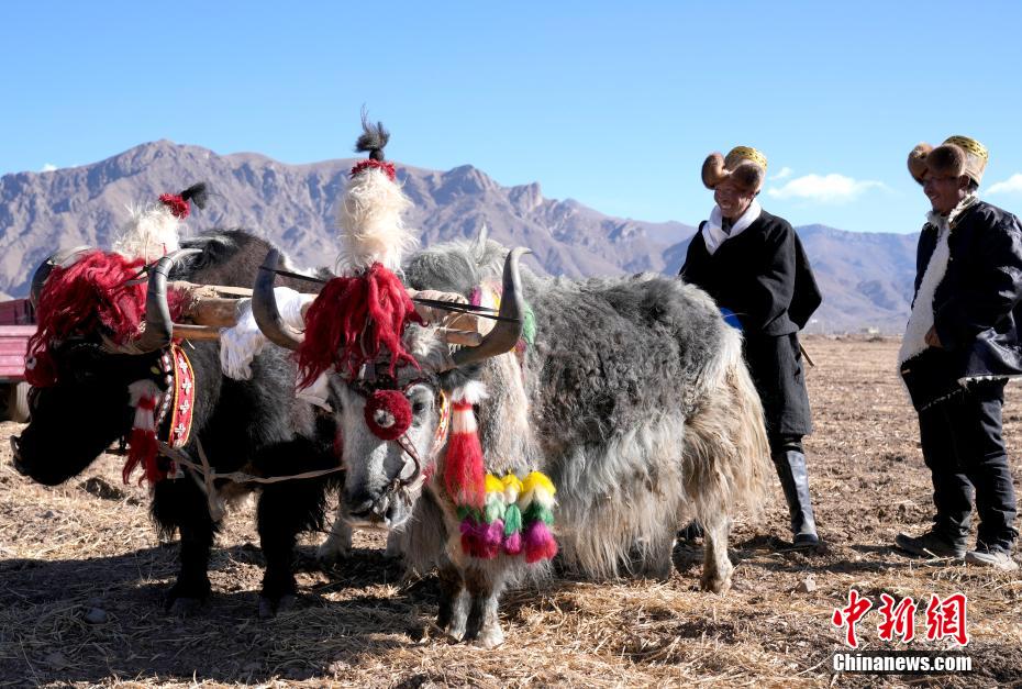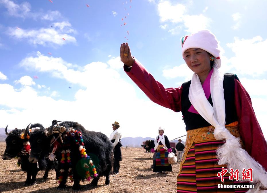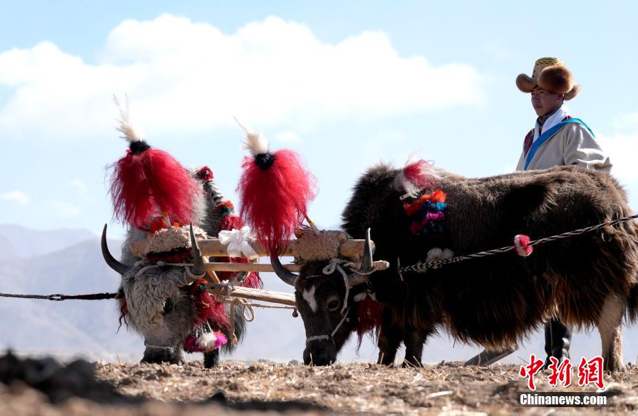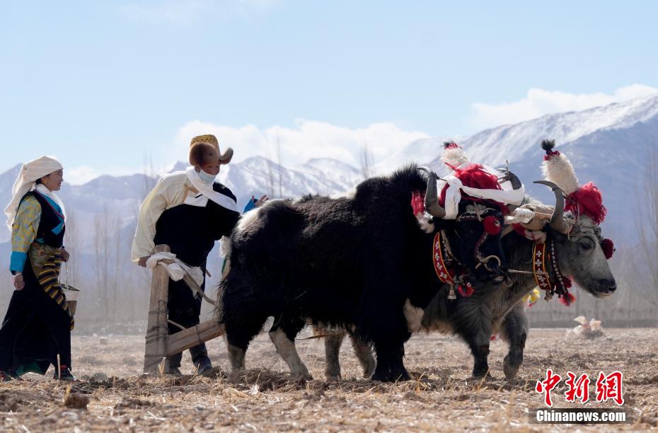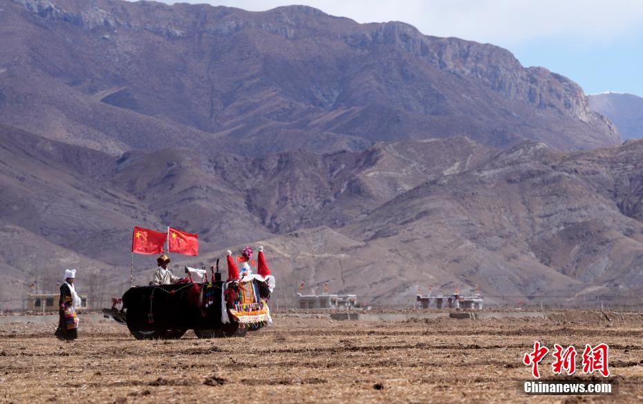 3月16日,是西藏農(nóng)區(qū)開耕的日子。村民身著節(jié)日盛裝,相聚在田間。傳統(tǒng)的“二牛抬杠”開啟“第一犁”后,拖拉機緊隨其后,婦女將手中的種子撒下,祈求風調(diào)雨順、農(nóng)業(yè)豐收。圖為西藏拉薩市林周縣強嘎鄉(xiāng)春耕儀式現(xiàn)場,“二牛抬杠”開啟“第一犁”。中新社記者 李林 攝