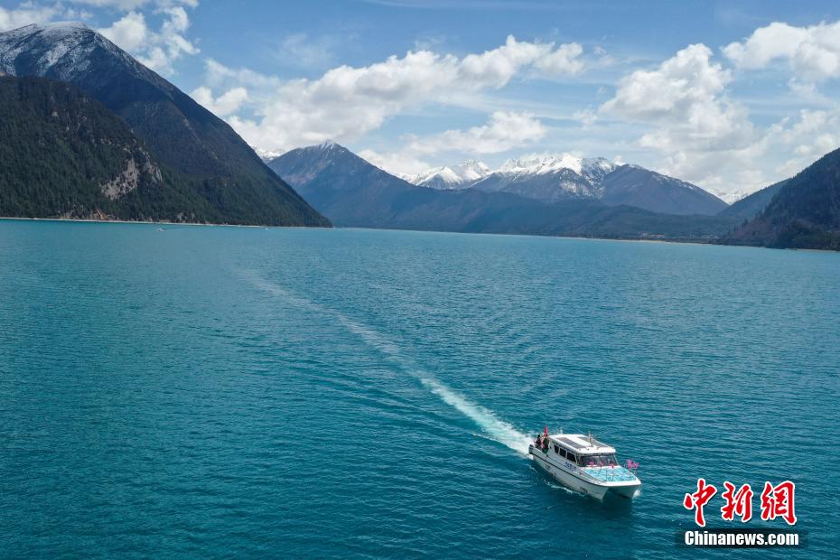 4月6日,西藏林芝工布江達縣巴松措景區(qū)游人如織。春日里,湛藍(lán)湖水與巍峨雪山相映成趣,游客游玩湖心島或乘船游覽,沉醉在這湖光山色中。圖為巴松措里的游船。(無人機照片)中新社記者 貢嘎來松 攝