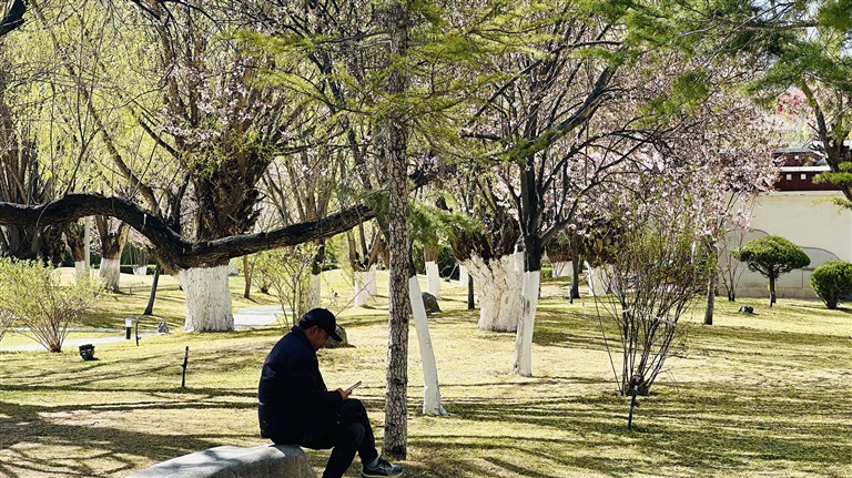 在拉薩,賞花從不必刻意尋找景區(qū),許多街道便藏著盎然春色。四月的拉薩城西,也有著令人目不暇接的美好。八一路、羅堆西路、羅布林卡路一帶,除了常見的榆葉梅、紫葉李等,還藏著拉薩不常見的海棠花,此時(shí)的海棠花在綠葉的襯托下開得正艷。陽光灑下,花朵和葉子的顏色飽和度極高,微風(fēng)拂過,花瓣輕柔飄落,不少路人紛紛停下拍照,將明艷的春色收進(jìn)自己的手機(jī)。