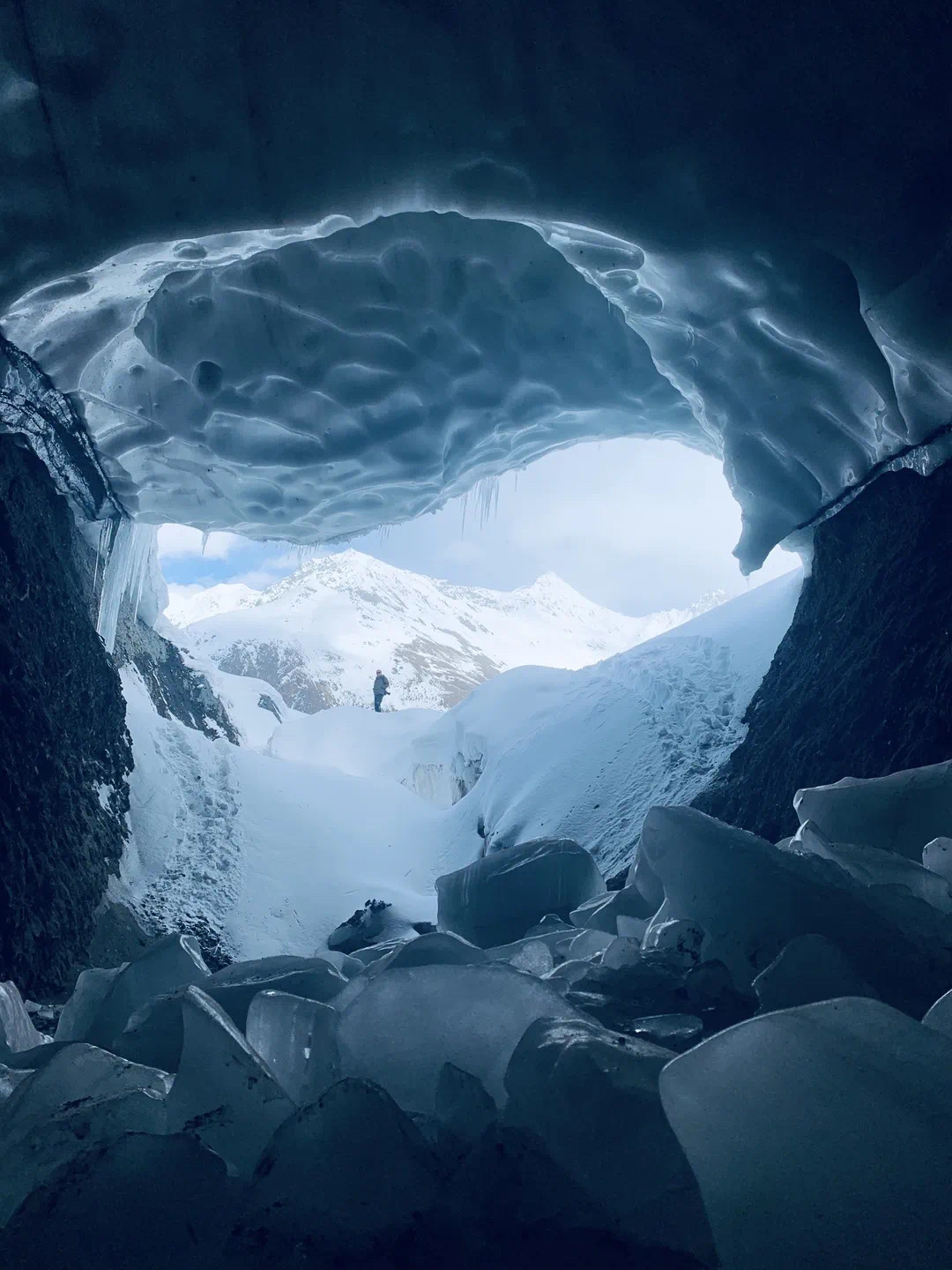 冰洞入口高約1米,需要彎著腰才能進(jìn)入。待完全進(jìn)入后,空間逐漸開(kāi)闊,冰洞內(nèi)別有洞天。冰壁深處透著蔚藍(lán),似是把邊壩的藍(lán)天鎖了進(jìn)去。冰洞最開(kāi)闊的地方有一處冰臺(tái),游客在那里打卡拍照,記錄下這絕美的風(fēng)光。