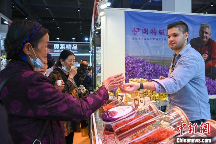 圖為拉薩進(jìn)口商品展覽會(huì)現(xiàn)場(chǎng),伊朗商人(右)向顧客品嘗藏紅花。中新社記者 貢嘎來松 攝