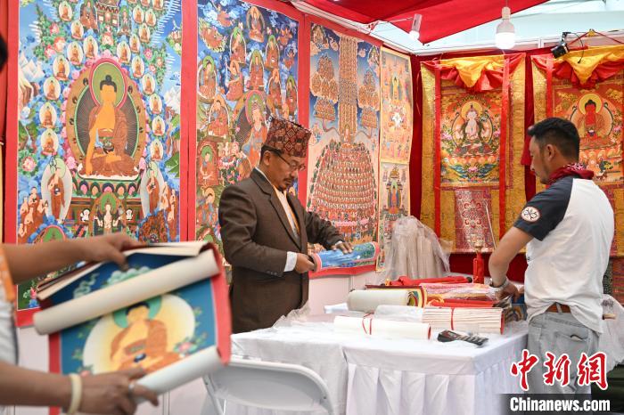 圖為拉薩進(jìn)口商品展覽會(huì)現(xiàn)場(chǎng),尼泊爾商人介紹、推銷自己的商品。中新社記者 貢嘎來松 攝
