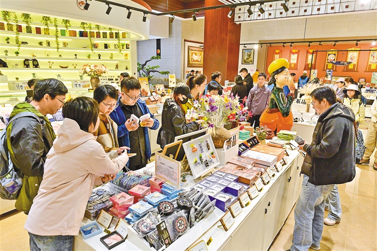 市民游客在西藏博物館內(nèi)選購文創(chuàng)產(chǎn)品。