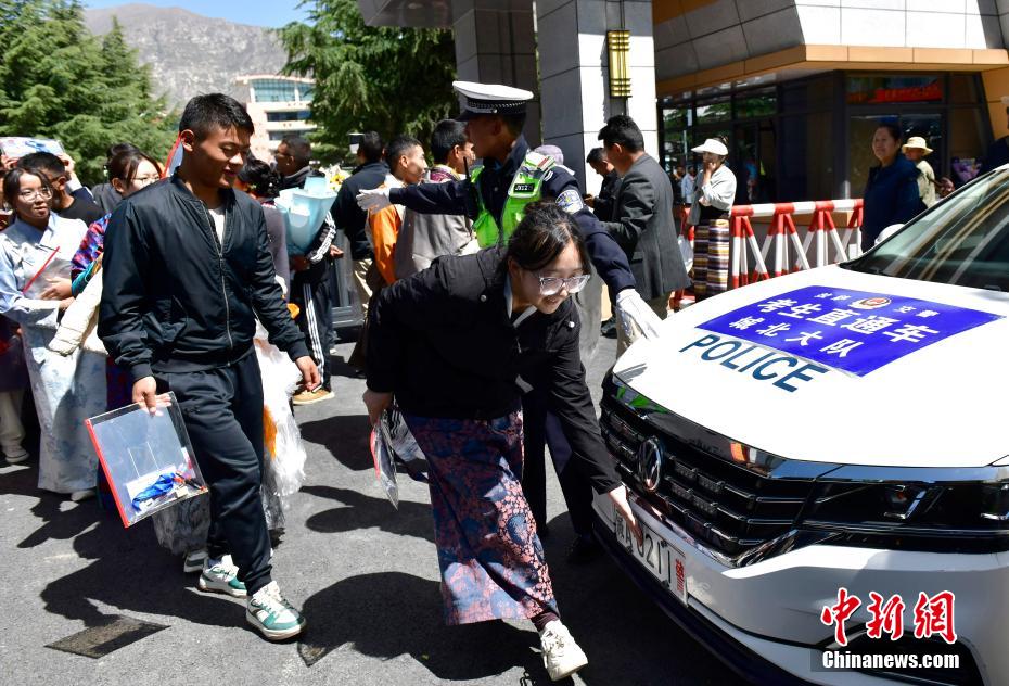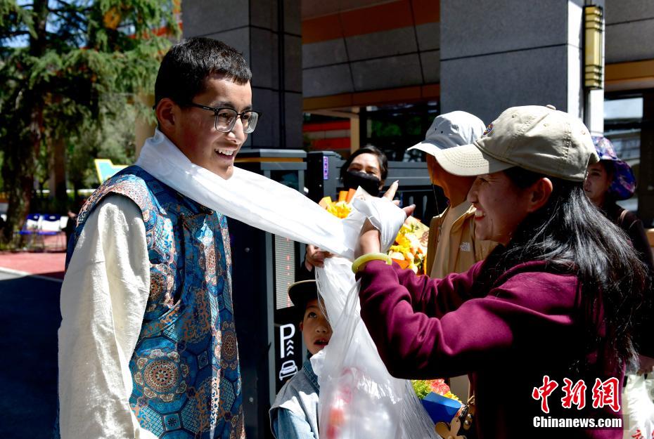 6月9日上午11時30分,西藏自治區(qū)2025年普通高考完成所有科目考試。圖為家長在拉薩市拉薩中學(xué)考點(diǎn)外為結(jié)束考試的孩子獻(xiàn)哈達(dá)。中新社記者 李林 攝