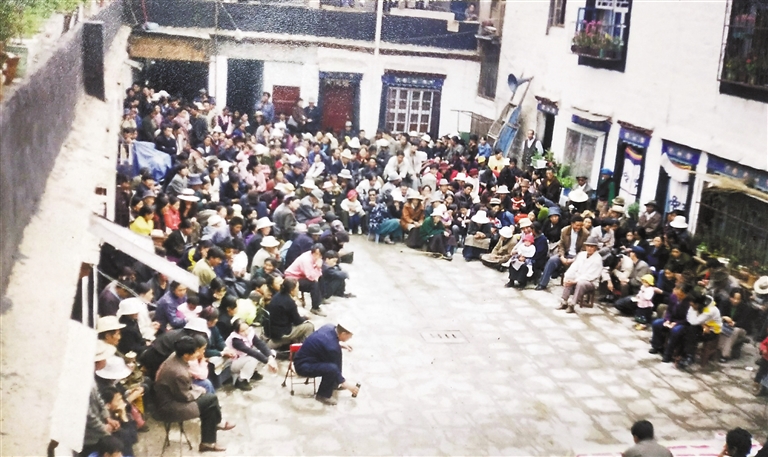 在當(dāng)時(shí)拍的另一張照片上,幾十位居民擠在過道里準(zhǔn)備投票。“那時(shí)候院子小,選舉時(shí)得側(cè)著身子站。”德吉卓嘎回憶道,“院子窄小,雨天積水,但絲毫不影響大家參與社區(qū)事務(wù)的熱情。”照片的一角,13歲的普布普赤正躲在母親身后好奇張望,如今她41歲,已成長為大院的戶長。