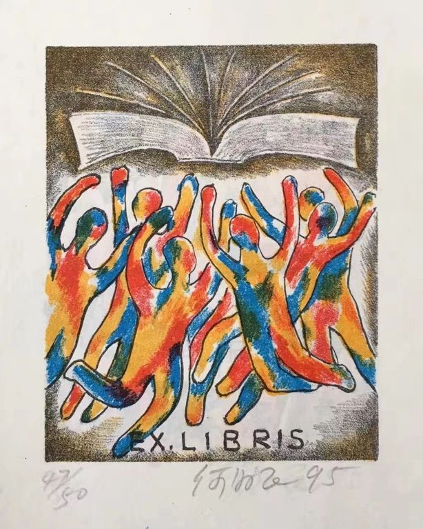 何為民創(chuàng)作的套色石版畫藏書票,該作品曾獲全國第六屆藏書票展銀獎(jiǎng)。受訪者供圖