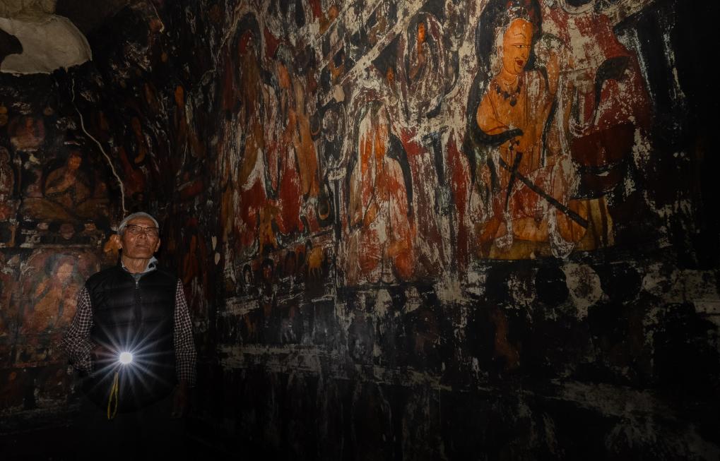 仁增旺扎巡查各個石窟,這是他多年來的習(xí)慣(2023年5月26日攝)。