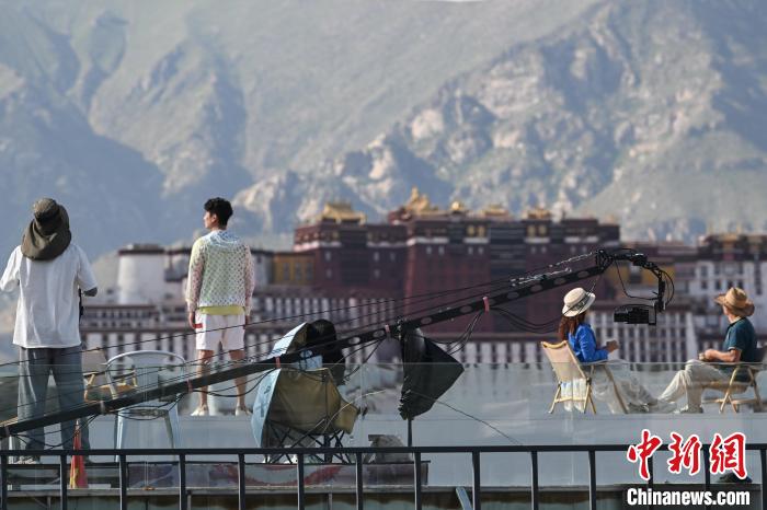7月7日,游客在西藏拉薩市的一家景觀咖啡廳拍攝以布達拉宮為背景的 “旱地拔蔥” 。中新社記者 貢嘎來松 攝