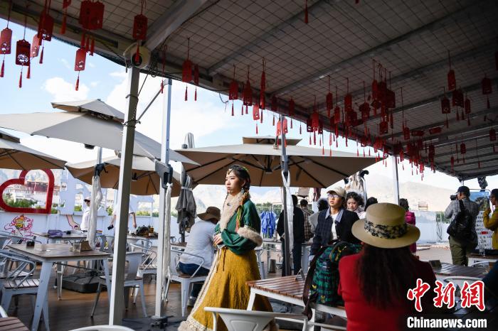 7月7日,游客在西藏拉薩市的一家景觀咖啡廳等待拍攝以布達拉宮為背景的 “旱地拔蔥” 。中新社記者 貢嘎來松 攝