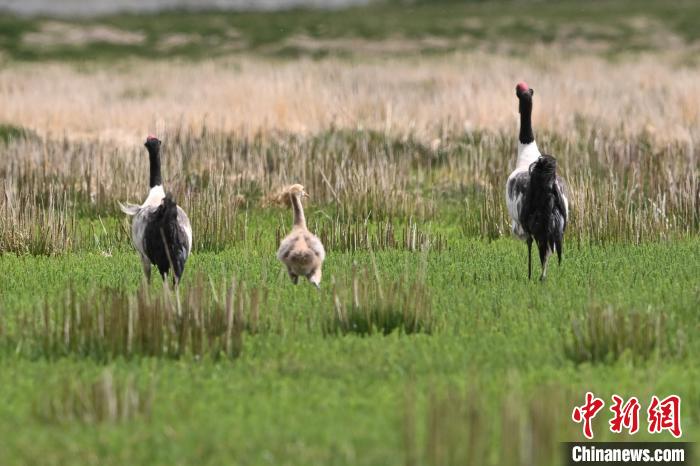 7月10日,在海拔4700米的西藏自治區(qū)那曲市申扎縣濕地里,黑頸鶴一家在悠閑覓食。黑頸鶴是中國(guó)國(guó)家一級(jí)重點(diǎn)保護(hù)野生動(dòng)物,屬高原特有鶴類,主要棲息于海拔2500米至5000米的高原沼澤地、湖泊及河灘等濕地環(huán)境。每年四月起,成對(duì)的黑頸鶴陸續(xù)飛抵西藏自治區(qū)那曲市申扎縣,在此繁育后代。近年來(lái),申扎縣持續(xù)加強(qiáng)生態(tài)修復(fù),濕地面積擴(kuò)大、水質(zhì)改善,為黑頸鶴等珍稀物種提供了理想家園。中新社發(fā) 毛建軍 攝