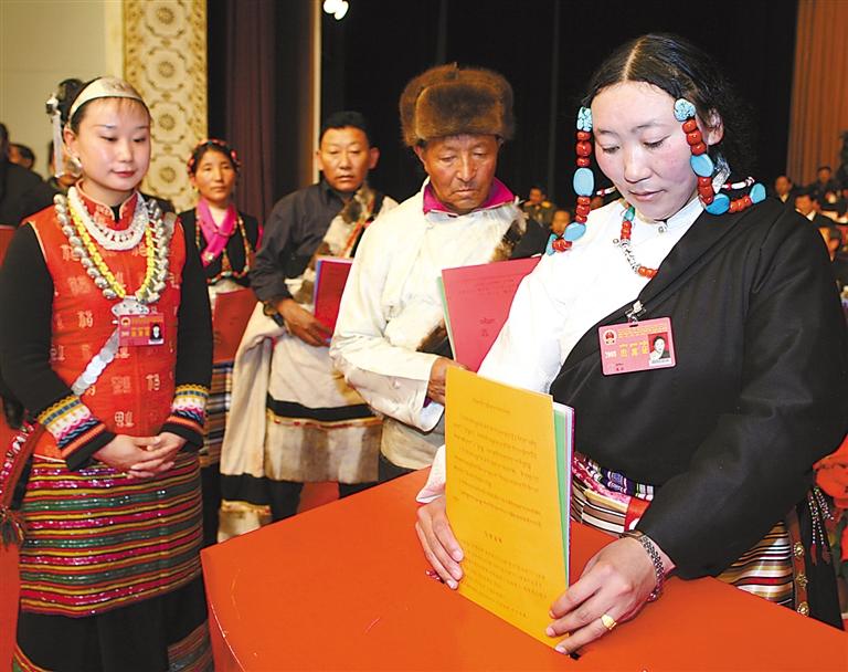 圖為代表們在西藏自治區(qū)九屆人大一次會議上投票(2008年1月攝)。