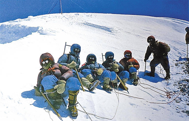 據(jù)羅則介紹,50年前,“九勇士”成功從北坡登頂珠峰之后,隨即開展了向黨和人民匯報(bào)勝利的喜訊、豎立金屬覘標(biāo)測(cè)量珠峰高度、展示五星紅旗、拍攝在頂峰活動(dòng)資料、搜集山頂冰雪樣品、遙測(cè)地球最高點(diǎn)上的人類心電圖、測(cè)量峰頂上的覆雪深度、采集峰頂花崗巖石標(biāo)本、拍攝頂峰全景的電影、把毛主席石膏塑像安放在峰頂上、為登頂勇士拍攝紀(jì)念照片11項(xiàng)工作。