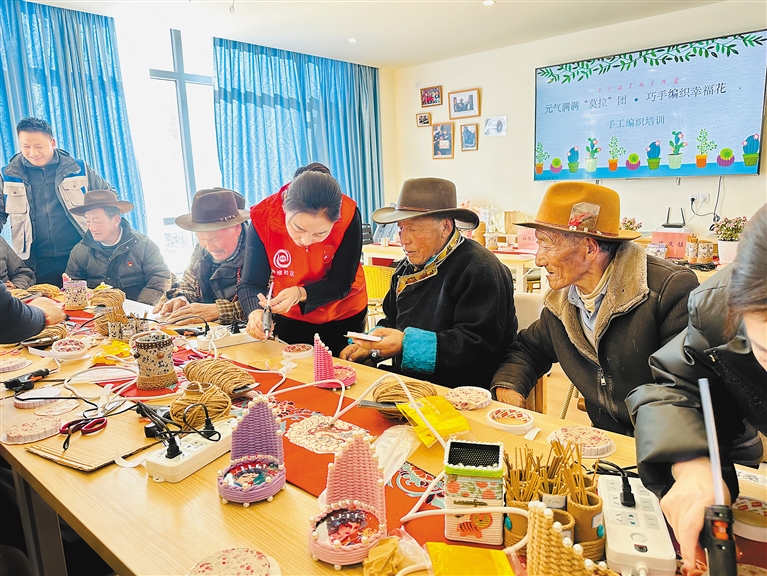 圖為堆龍德慶區(qū)德慶鎮(zhèn)老幼日間照料中心社工與老人共同制作手工藝品。通訊員 白瑪央金 攝