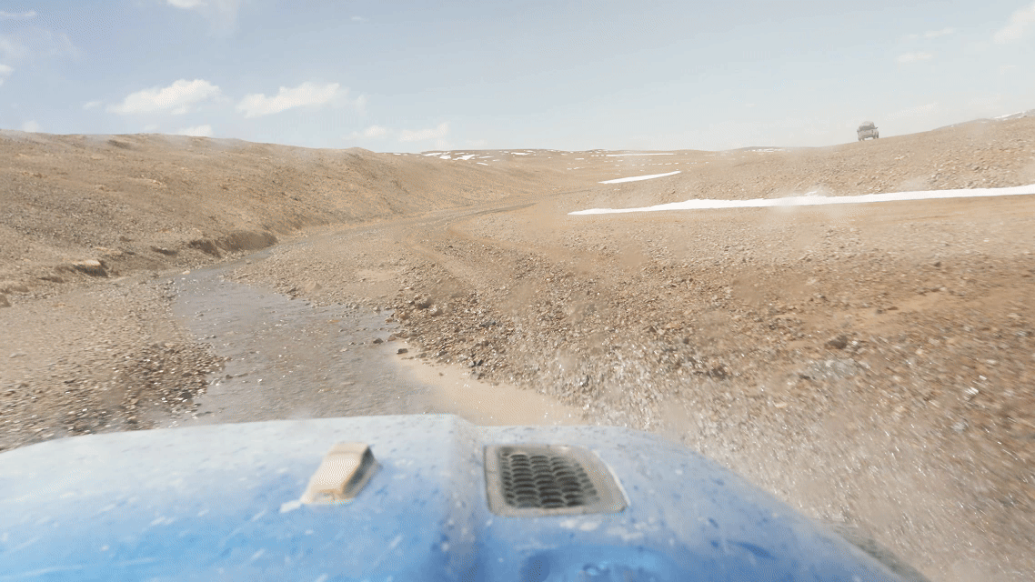 為了拍下野保員的日常工作以及藏羚羊大遷徙的宏大場(chǎng)面,我們一行跟隨巡護(hù)車(chē),向著保護(hù)區(qū)核心區(qū)進(jìn)發(fā)。路面逐漸從“蜿蜒崎嶇的溪流”變成“波濤洶涌的大?!?,越野車(chē)內(nèi)好像一個(gè)迪斯科舞池,每一件東西都像被賦予了生命一般蹦蹦跳跳,伴隨著我們這些乘客的驚呼,連同引擎的轟鳴一起,揉碎在無(wú)邊荒原的呼嘯風(fēng)聲中。