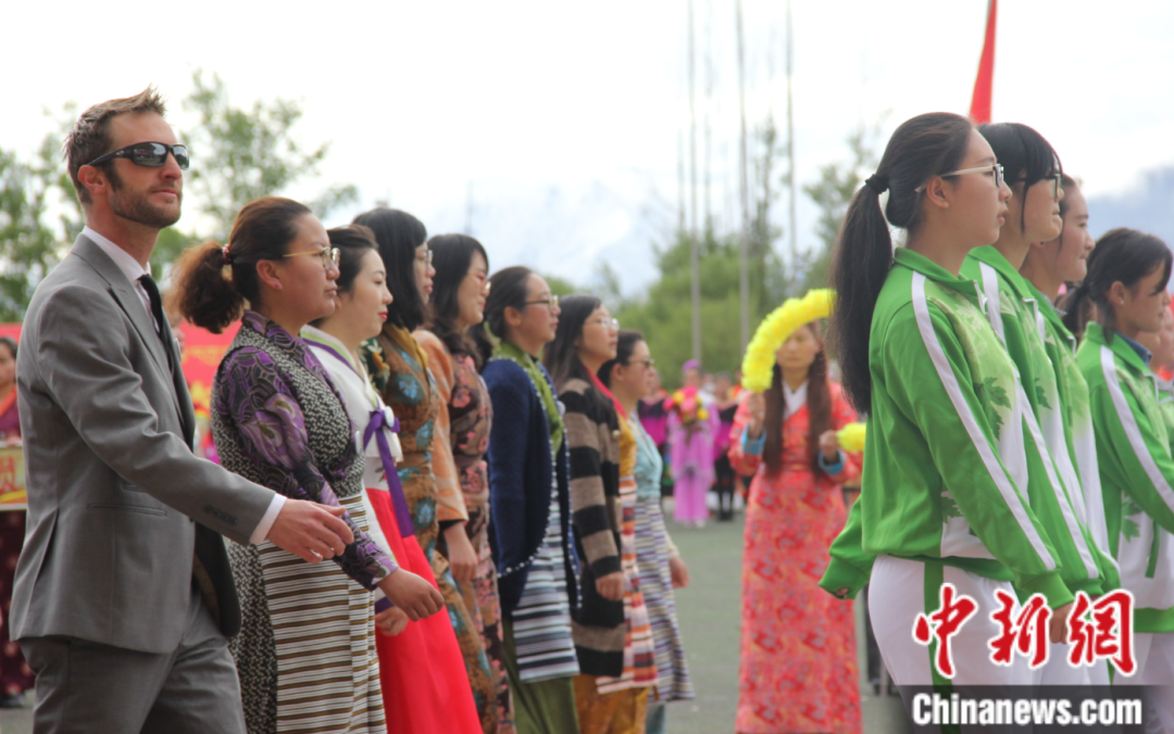 2017年5月11日,西藏大學(xué)舉行第二十八屆田徑運(yùn)動會,數(shù)十名外籍留學(xué)生和外籍教師參加了開幕式。圖為開幕式中旅游與外語學(xué)院方隊 劉蔭 攝