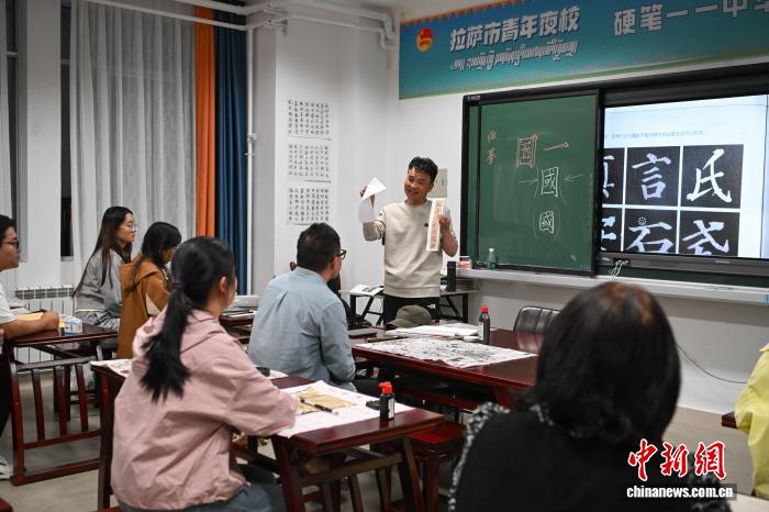 9月1日,2025年西藏自治區(qū)拉薩市第二期“青年夜?!闭介_班。圖為夜校學(xué)員在上書法課。中新社記者 貢嘎來松 攝