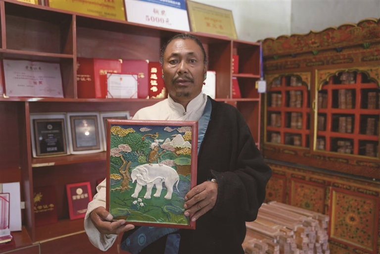 為了進一步傳承和發(fā)展普松雕刻技藝,同時帶動鄉(xiāng)親們增收致富,2019年,斯曲成立了尼木縣珍寶民族雕刻手工藝農(nóng)牧民專業(yè)合作社。合作社成立之初,只有8名徒弟追隨他,而如今,這支隊伍已經(jīng)壯大到了12人,并帶動村里50余人實現(xiàn)就近就業(yè),為當?shù)氐慕?jīng)濟發(fā)展注入了新的活力。同時,隨著政府對傳統(tǒng)手藝的重視程度不斷提高,以及旅游業(yè)的蓬勃發(fā)展,來當?shù)氐挠慰腿找嬖龆?。這不僅讓普松雕刻這門技藝被更多人所知曉,也極大地拓寬了合作社的銷售渠道。