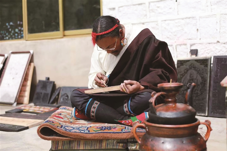 在傳承技藝的過程中,斯曲也面臨著不少挑戰(zhàn)。教徒弟時最大的困難就是讓他們靜下心來,因為這門手藝需要從小學(xué)起,不僅要學(xué)習(xí)拿工具,還要學(xué)習(xí)認字和雕刻?!耙郧肮馐菍W(xué)習(xí)雕刻文字,起碼要9個月時間,現(xiàn)在的孩子都很聰明,兩年基本就能掌握雕刻技藝?!彼骨牢康卣f。