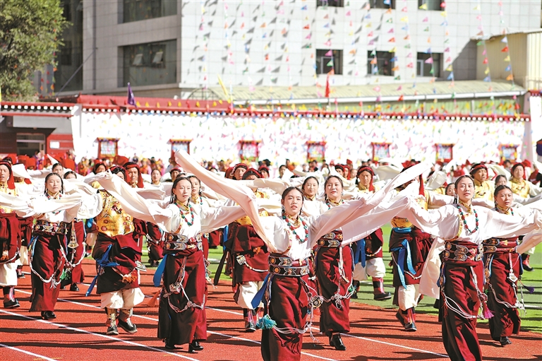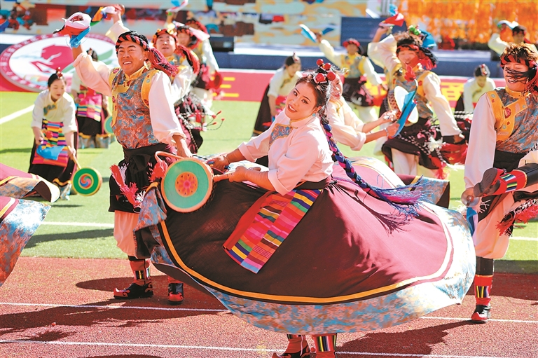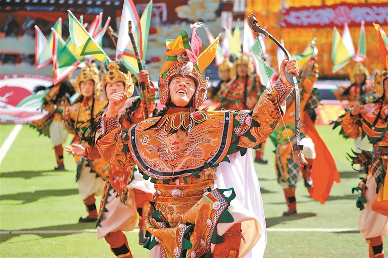 9月15日舉行的第十一屆三江茶馬文化藝術(shù)節(jié)開幕式上,來自昌都11個(gè)縣(區(qū))的群眾代表組成游行方隊(duì),載歌載舞,繞場(chǎng)一周,熱烈激昂的丁青熱巴、豪邁威武的類烏齊嶺卓舞、優(yōu)美歡快的芒康弦子等非遺舞蹈,向現(xiàn)場(chǎng)的干部群眾和各界來賓展示了昌都獨(dú)特的傳統(tǒng)文化和熱情好客的真摯情誼。隨后的文藝表演以歌舞和情景劇的形式,從金沙江的紅色記憶,到怒江的文化傳承,再到瀾滄江的高質(zhì)量發(fā)展之光,描摹出了昌都?xì)v史文化的主要脈絡(luò)和經(jīng)濟(jì)社會(huì)發(fā)展取得的巨大成就,為現(xiàn)場(chǎng)觀眾奉獻(xiàn)了一場(chǎng)難忘的文藝盛宴。
