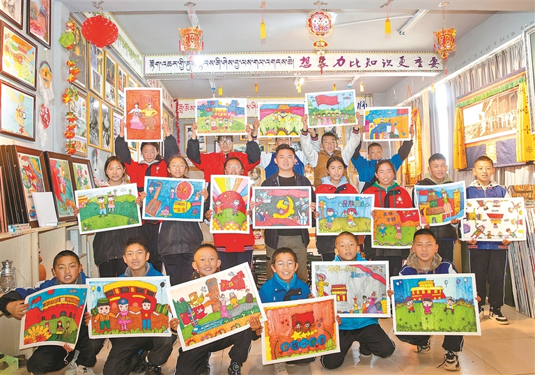 山南市桑日縣中學(xué)美術(shù)興趣社團(tuán)的學(xué)生展示自己的以“鑄牢中華民族共同體意識(shí)”為主題的繪畫(huà)作品。記者 洛桑 通訊員 次仁龍布 攝