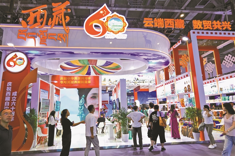 9月25日,第四屆全球數(shù)字貿易博覽會(以下簡稱“數(shù)貿會”)在杭州大會展中心啟幕,絲路電商館內的西藏展館憑借鮮明的地域特色與發(fā)展亮點,吸引眾多參會者駐足。入口顯眼處高掛西藏自治區(qū)成立60周年慶?;顒踊諛耍群魬匾獨v史節(jié)點,更彰顯著高原大地以數(shù)字為翼、加快推進開放發(fā)展的堅定步伐。