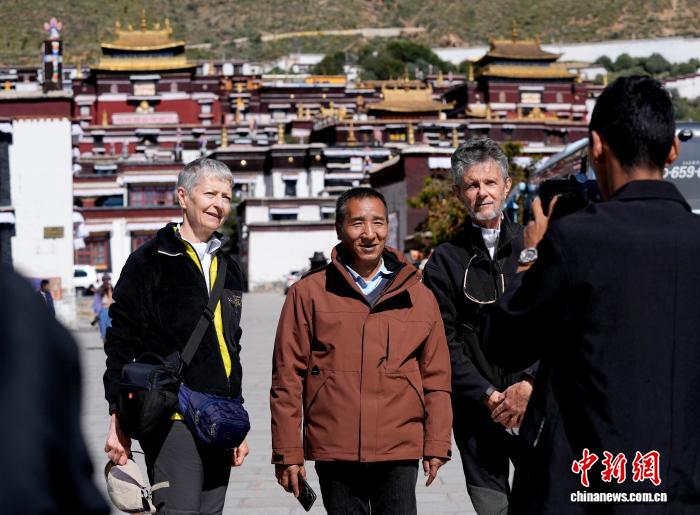 10月7日,外國(guó)游客在西藏日喀則市扎什倫布寺與導(dǎo)游合影留念。扎什倫布寺始建于公元1447年,是中國(guó)國(guó)家5A級(jí)旅游景區(qū)。憑借深厚的歷史底蘊(yùn)和獨(dú)特的文化魅力,吸引眾多中外游客參觀(guān)游覽。中新社記者 李林 攝