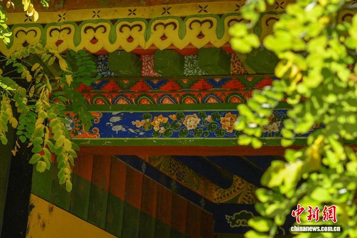 圖為羅布林卡內(nèi)樹木葉片與藏式建筑相映成景。貢確 攝