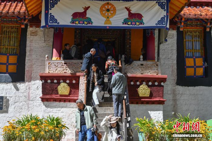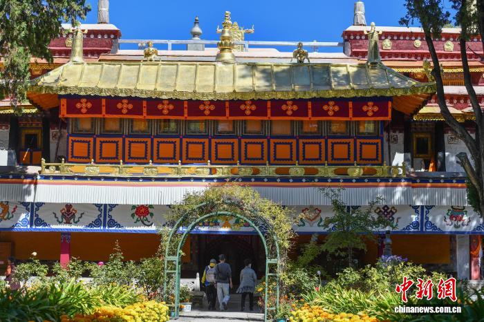 圖為游客在羅布林卡內(nèi)游覽金色頗章。貢確 攝