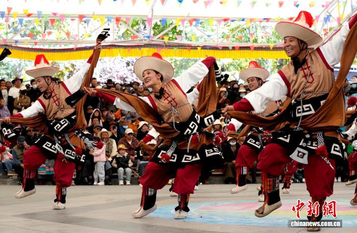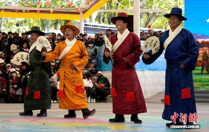 10月19日,“格?;ū崩_市第六屆縣(區(qū))藝術(shù)團文藝調(diào)演頒獎活動在布達拉宮腳下的宗角祿康公園舉行?,F(xiàn)場,拉薩市各縣(區(qū))藝術(shù)團帶來精彩節(jié)目。圖為文藝調(diào)演頒獎活動上的文藝表演。中新社記者 李林 攝