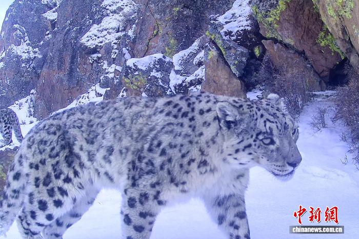 2025年4月13日,西藏拉薩乃朗谷雪豹重要棲息地記錄到雪豹“拉姆”“帶娃”現(xiàn)身于紅外相機前。(乃朗生態(tài)文化保護中心供圖)