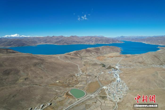 10月25日,西藏山南羊卓雍錯東北岸東拉鄉(xiāng)沿線風(fēng)光,遠處雪山皚皚。(無人機畫面)中新社記者 江飛波 攝