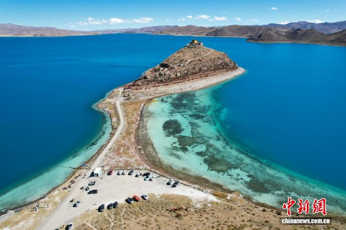 10月25日,西藏羊卓雍錯日托寺風(fēng)光。日托寺位于半島上,形成了“古剎”“孤寺”景觀,近年在網(wǎng)絡(luò)平臺持續(xù)火熱。(無人機畫面)中新社記者 江飛波 攝