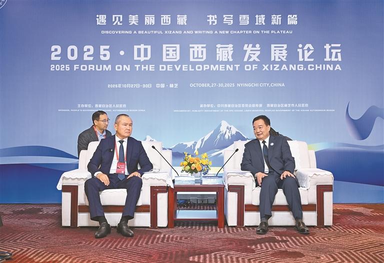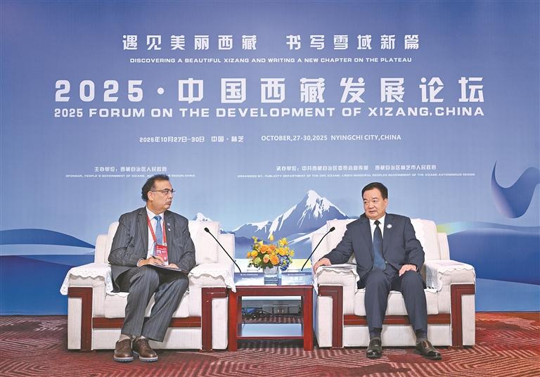 10月28日,自治區(qū)黨委書記王君正在林芝會(huì)見參加2025·中國西藏發(fā)展論壇的外國政要和駐華使節(jié)。這是王君正會(huì)見聯(lián)合國秘書長(zhǎng)古特雷斯先生的代表,聯(lián)合國教科文組織駐華代表、東亞辦事處主任兼代表夏澤翰。本報(bào)記者 旦增西旦 攝