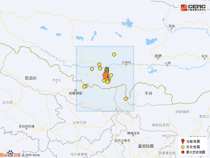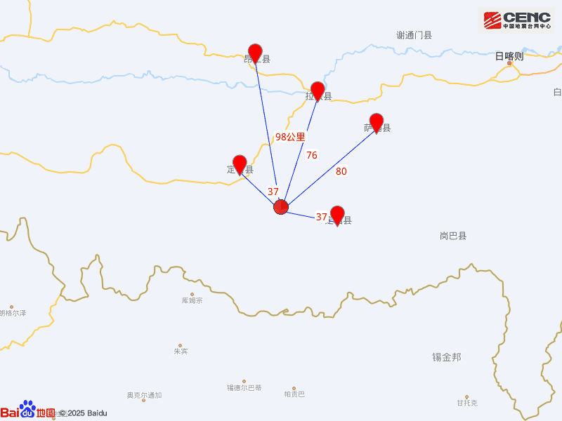 周邊縣城:震中距定日縣37公里、距定結(jié)縣37公里、距拉孜縣76公里、距薩迦縣80公里、距昂仁縣98公里,距日喀則市172公里,距拉薩市386公里。