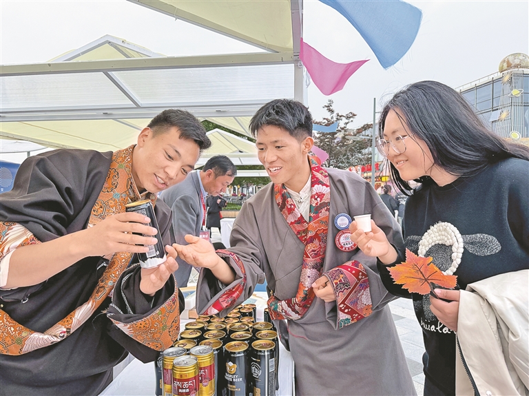 圖為南京市民在凈土產(chǎn)品展銷攤位前品嘗青稞酒。