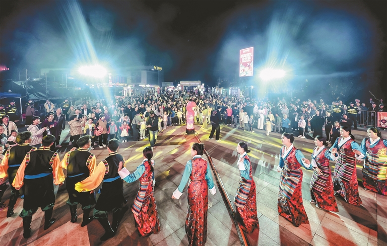 圖為萬人鍋莊晚會現(xiàn)場,南京市民與墨竹工卡縣松贊藝術團演職人員一起跳鍋莊。