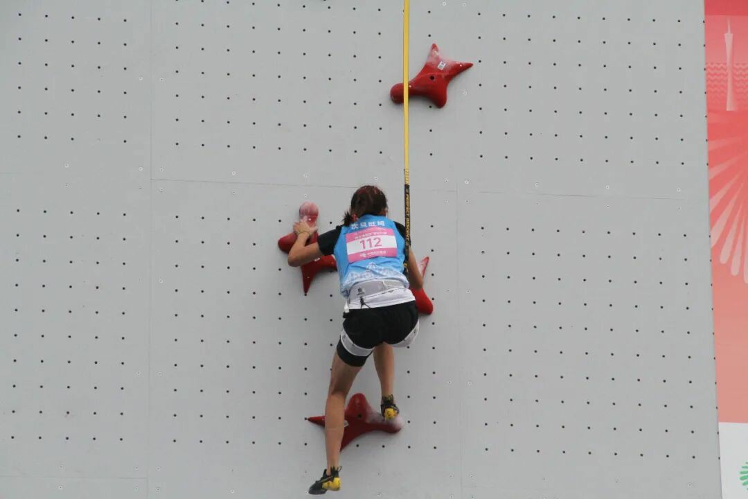 西藏隊次旦旺姆在十五運會攀巖項目女子速度攀巖預(yù)賽賽場上。