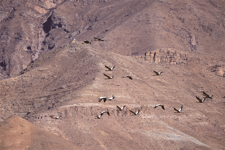 每年10月至次年4月,黑頸鶴遷徙至拉薩越冬。林周縣因其獨(dú)特的濕地與耕地資源,成為黑頸鶴的核心棲息地。每年11月底至12月,黑頸鶴陸續(xù)集結(jié)于此。近三年,越冬的黑頸鶴數(shù)量穩(wěn)定在1600至2300只,占拉薩越冬黑頸鶴總數(shù)的近六成。
