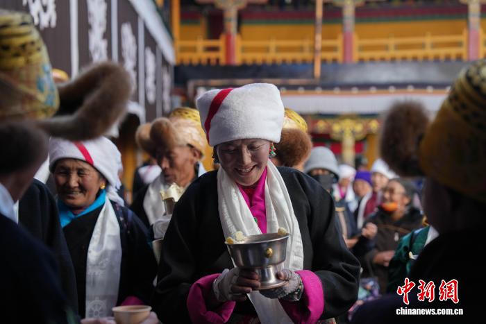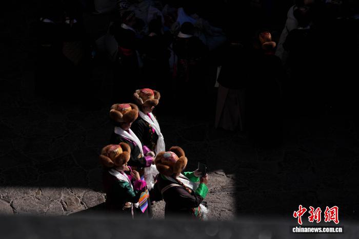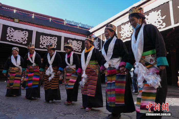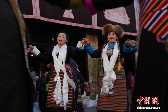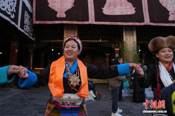 圖為白拉姆節(jié)臨近之際,信眾在大昭寺內(nèi)敬獻(xiàn)供品后載歌載舞的場(chǎng)景。貢確 攝