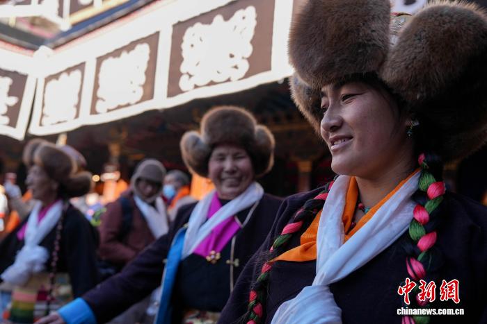 11月28日,隨著藏歷十月十五白拉姆節(jié)臨近,連日來(lái),拉薩及周邊信眾身著色彩艷麗的藏裝節(jié)日盛裝,手持從家中精心準(zhǔn)備的頭等青稞酒、新收的青稞及新鮮水果,陸續(xù)前往大昭寺、色拉寺、哲蚌寺等寺廟朝拜祈福。大昭寺內(nèi),信眾敬獻(xiàn)供品后載歌載舞,歌聲悠揚(yáng)、舞步輕快,盡顯節(jié)日喜悅。白拉姆節(jié)又稱(chēng) “仙女節(jié)”。相傳,白拉姆是拉薩地區(qū)的保護(hù)神,是藏傳佛教最高護(hù)法神之一班丹拉姆的女兒。白拉姆曾與大昭寺護(hù)法神赤尊贊相互愛(ài)慕并私定終身,其母親班丹拉姆發(fā)現(xiàn)后,赤尊贊被趕到拉薩河南岸,每逢藏歷十月十五日,二人才能隔河相見(jiàn)一次。圖為白拉姆節(jié)臨近之際,信眾在大昭寺內(nèi)敬獻(xiàn)供品后載歌載舞的場(chǎng)景。貢確 攝